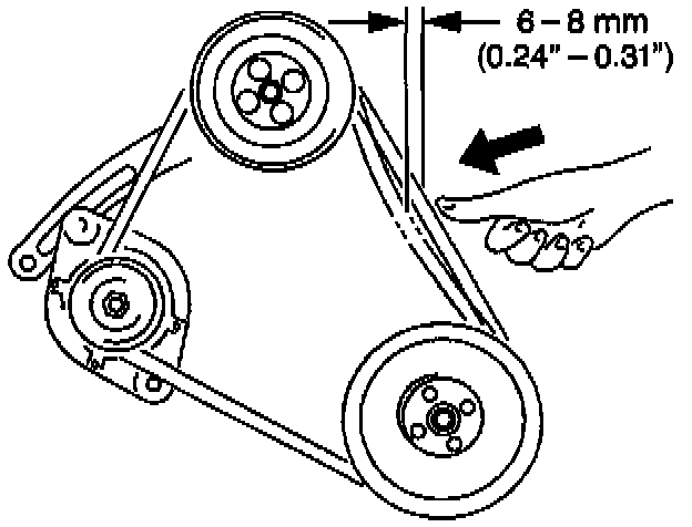 2. Adjust the A/C compressor drive belt to obtain 6-9 mm (0.24-0.35 in) deflection with 10 kg (22 lbs (thumb pressure) of force applied.