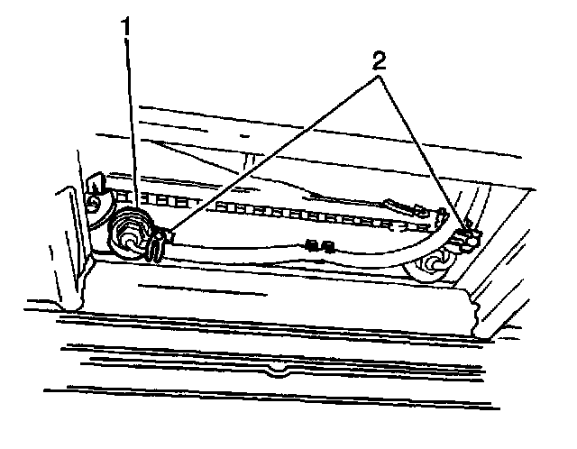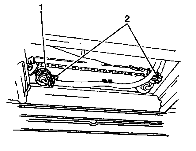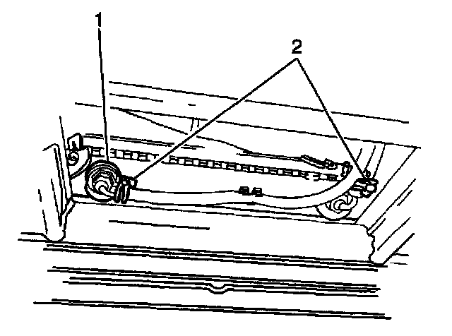 11. Remove the inlet and the outlet transmission cooler pipes (2, 1) from the transmission by loosening both of the flare nuts at the cooler pipe fittings.