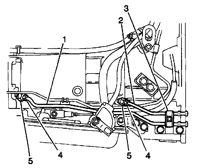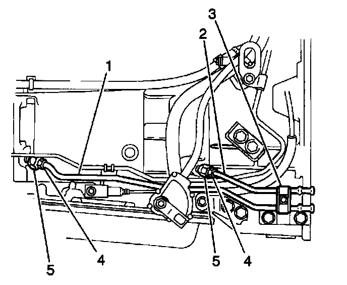1. Install the inlet and the outlet transmission cooler pipes (1, 2) to the transmission by threading both of the flare nuts into the cooler pipe fittings (5).