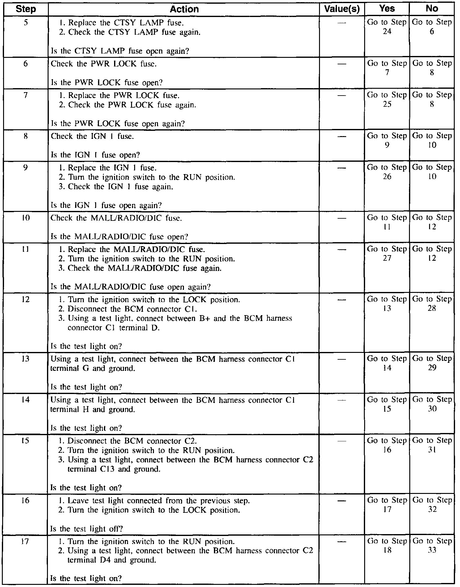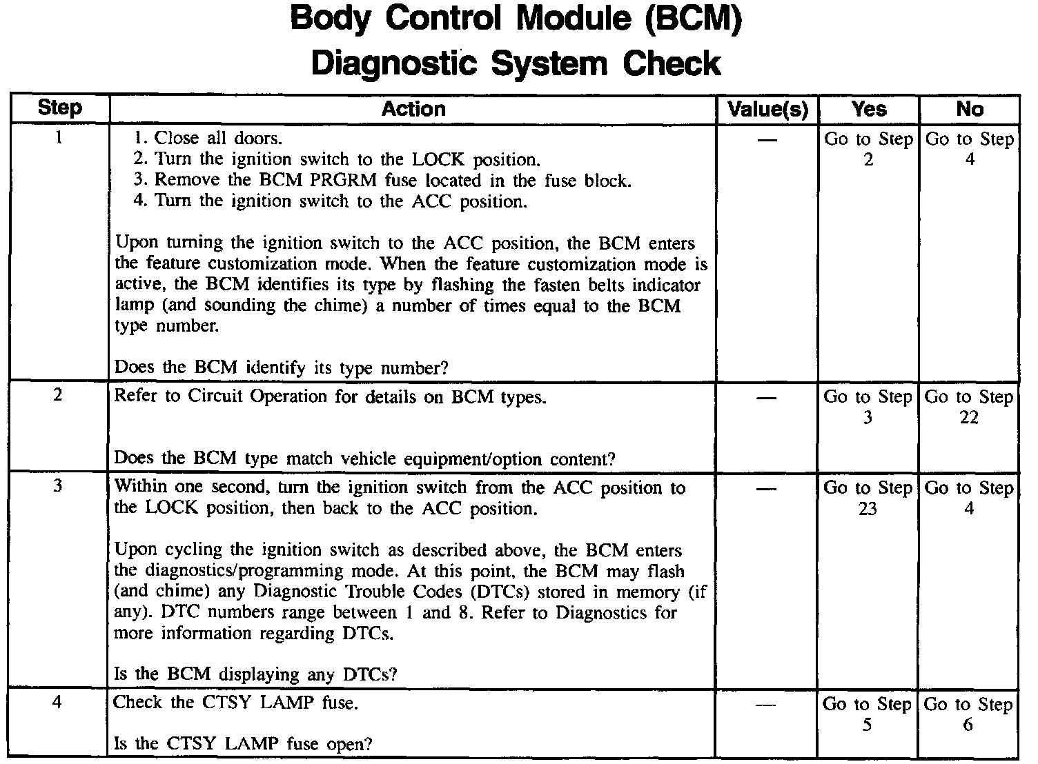 The Body Control Module (BCM) Diagnostic System Check is an organized approach to identify problems associated with the BCM. This check must be the starting point for any BCM complaint, and will direct you to the next logical step in diagnosing the complaint. The BCM is a very reliable component and is not likely the cause of the malfunction. Most system complaints are linked to faulty wiring and connectors, and occasionally to components. Understanding the computer system and using the tables correctly will reduce diagnostic time and prevent unnecessary parts replacement.