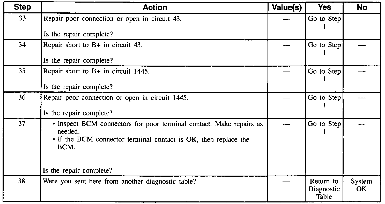 ^ An intermittent failure in the electronic system may be very difficult to detect and to accurately diagnose. The BCM tests for different malfunctions under different vehicle conditions. For this reason, a thorough test drive is often needed in order to repeat a fault condition. If the system malfunction is not repeated during the test drive, a good description of the complaint may be very useful in locating an intermittent fault condition. Faulty electrical connections or wiring causes most intermittent problems. When an intermittent condition is suspected, check the suspected circuits for the following conditions:
