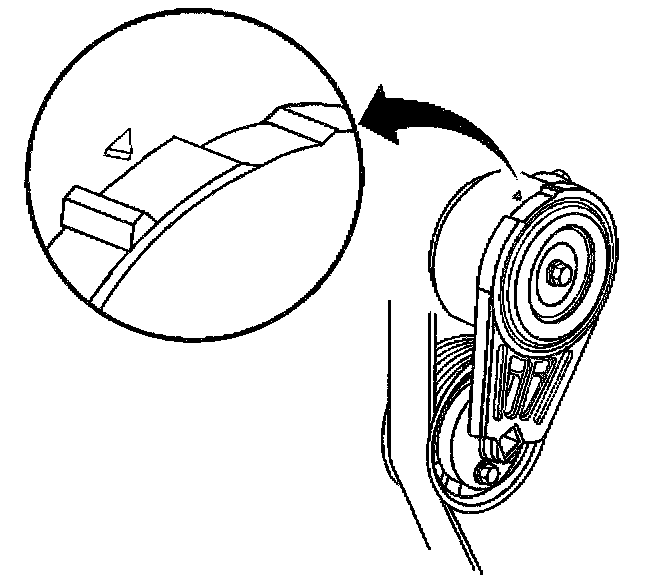 9. Confirm for the proper drive belt size and the correct drive belt routing by observing the location of the fix pointer and the index marks on the drive belt tensioner. With a new drive belt installed, the fix pointer should align within the indentation on the drive belt tensioner.