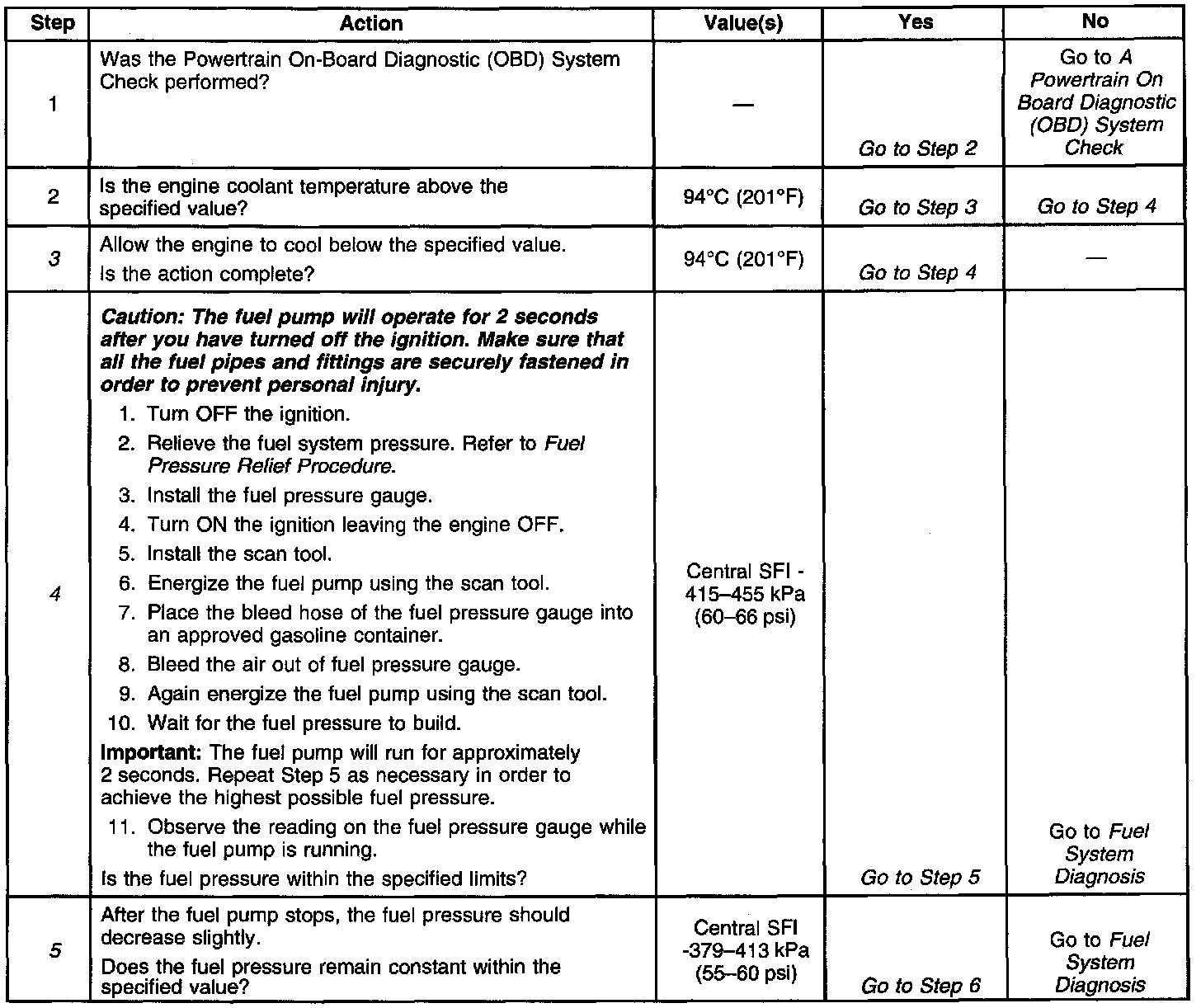 4. The fuel pressure should be within the specified range with the fuel pump running. If the fuel pressure is not within the specified range, go to Fuel System Diagnosis.