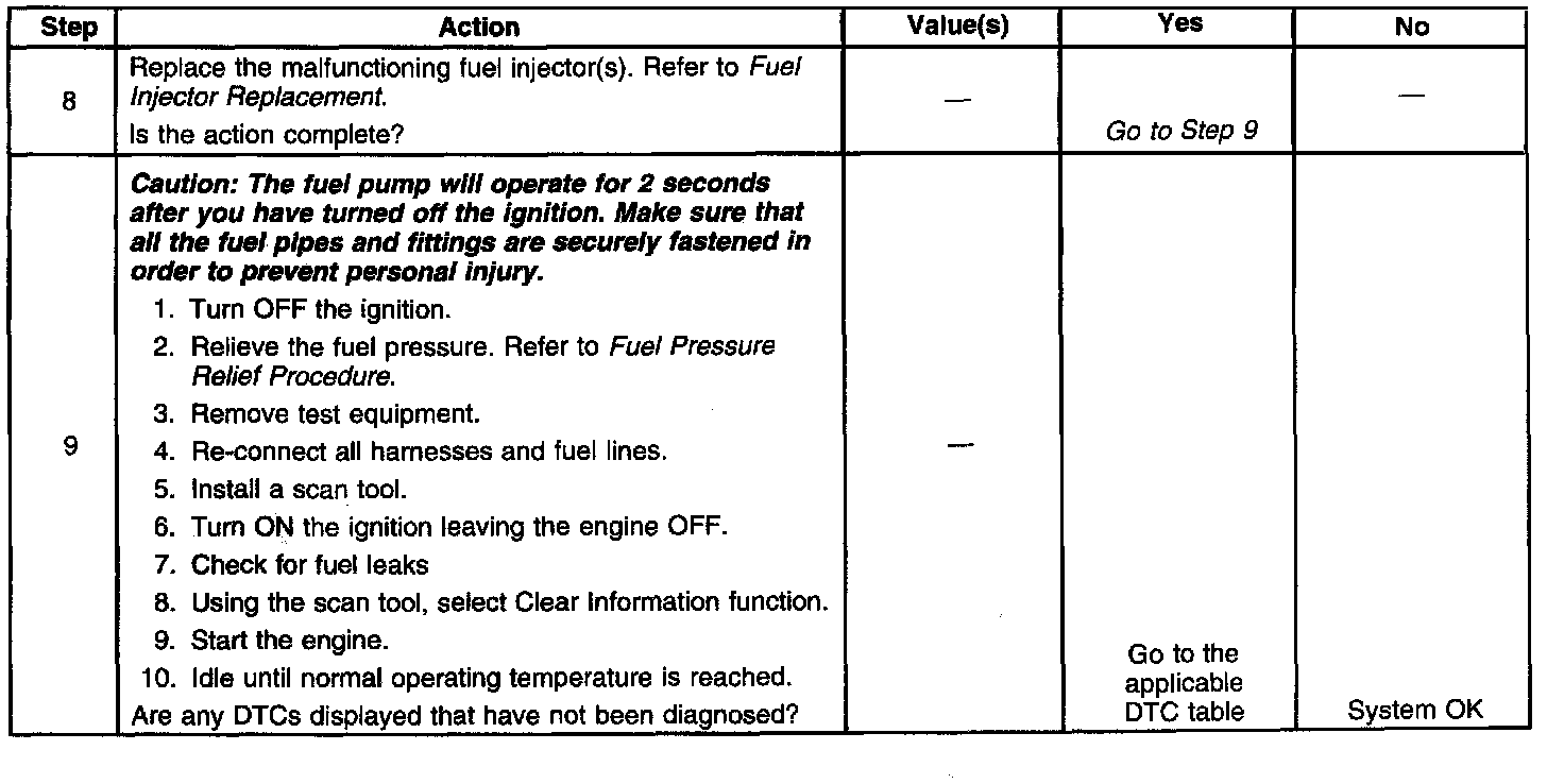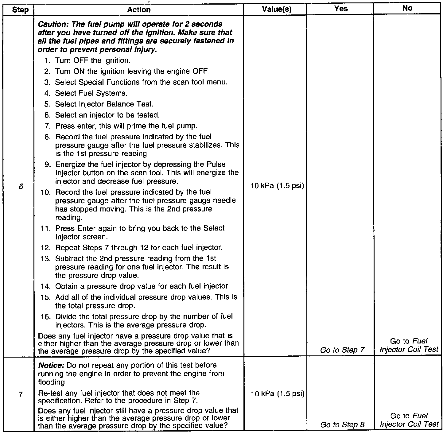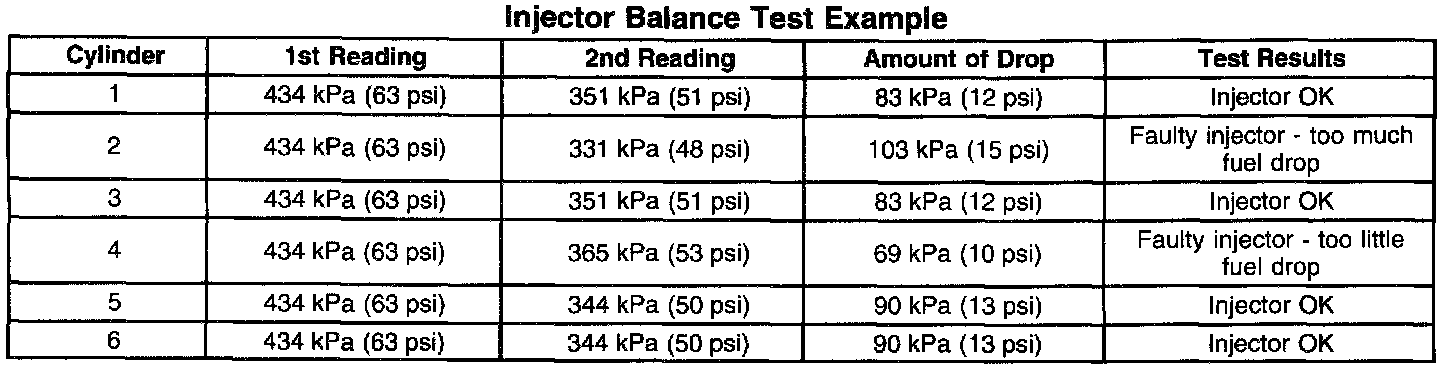 Test Results: Combine all of the injector pressure drops and divide this number by the amount of injectors available. This is the average pressure drop. Each individual injectors pressure drop value must be within 10 kPa (1.5 psi) of the average pressure drop value.