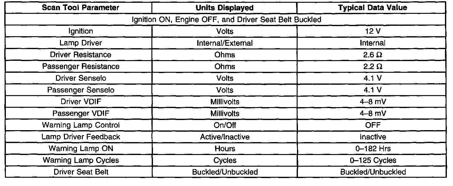 The SIR Scan Tool Data List contains all Restraint related parameters that are available on the scan tool. The list is arranged in the order as they appear on the scan tool.