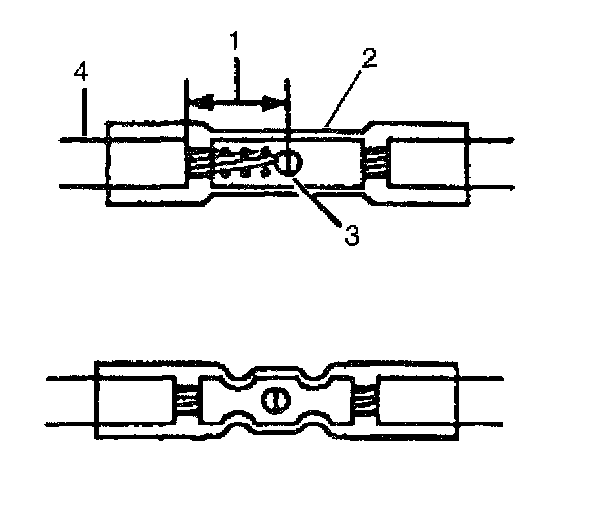 - Strip approximately 7.5 mm (5/16 inches) of insulation from each wire to be spliced (1).