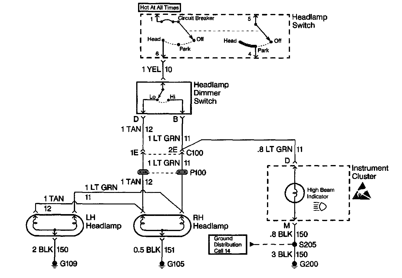At this point analyze and (diagnose the problem), and develop text. Since the high beam indicator illuminated when the headlamp dimmer switch was in the high position, the high contacts of the headlamp dimmer switch and the LT GRN wire between the headlamp dimmer switch and C100 are good. At this point, it is extremely unlikely that the high beam filaments in the RH and LH headlamps are both open or that both headlamp connections are bad. The cause must be a bad connection at C100 or an open in the LT GRN wire between C100 and the RH headlamp.