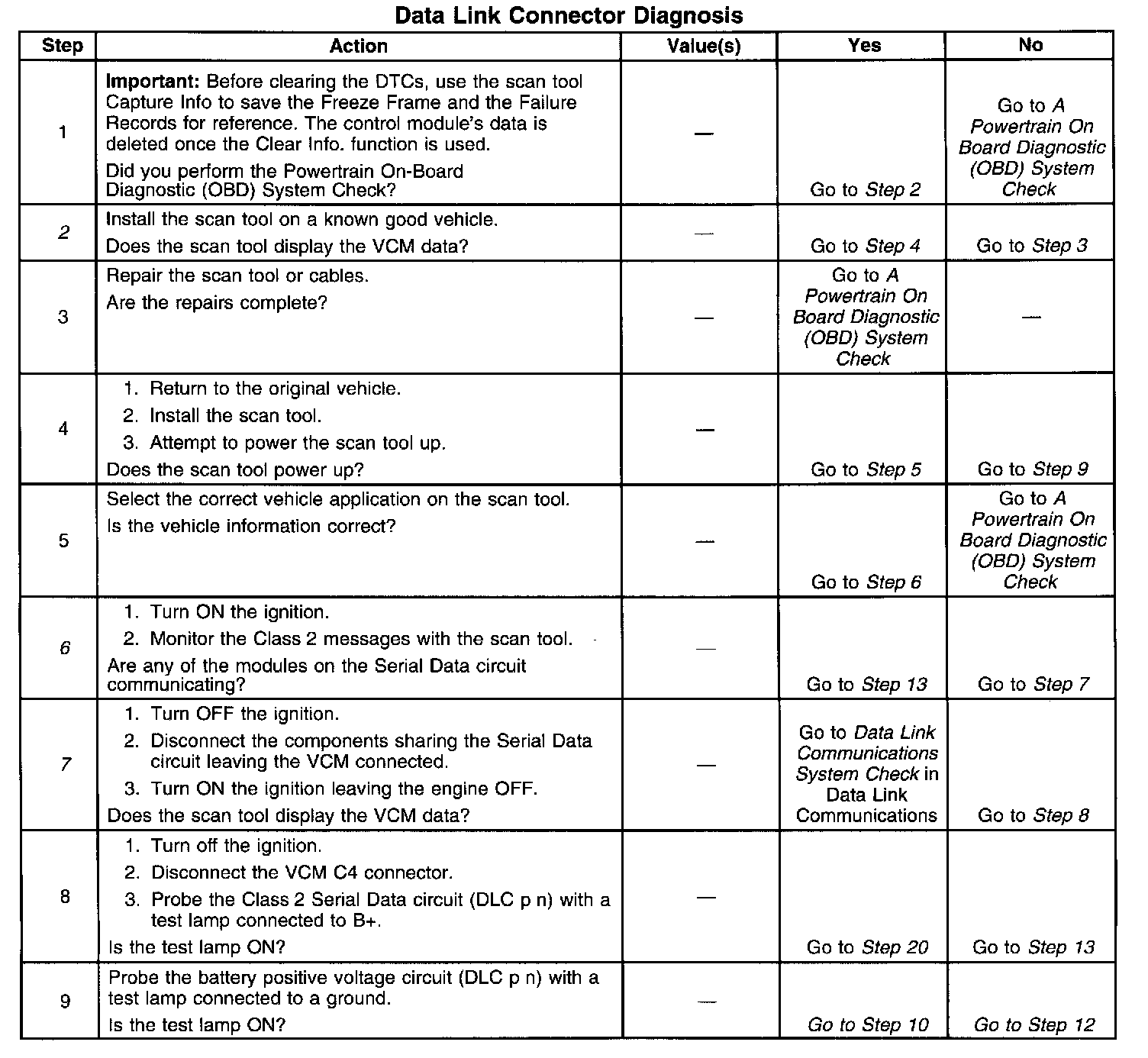 The Class 2 Serial Data circuit to the DLC allows bi-directional communication between the VCM and the scan tool. This is accomplished through pin of the DLC. If the communication between the scan tool and the VCM cannot be established, use the procedure in the DLC diagnosis table in order to diagnose the condition.