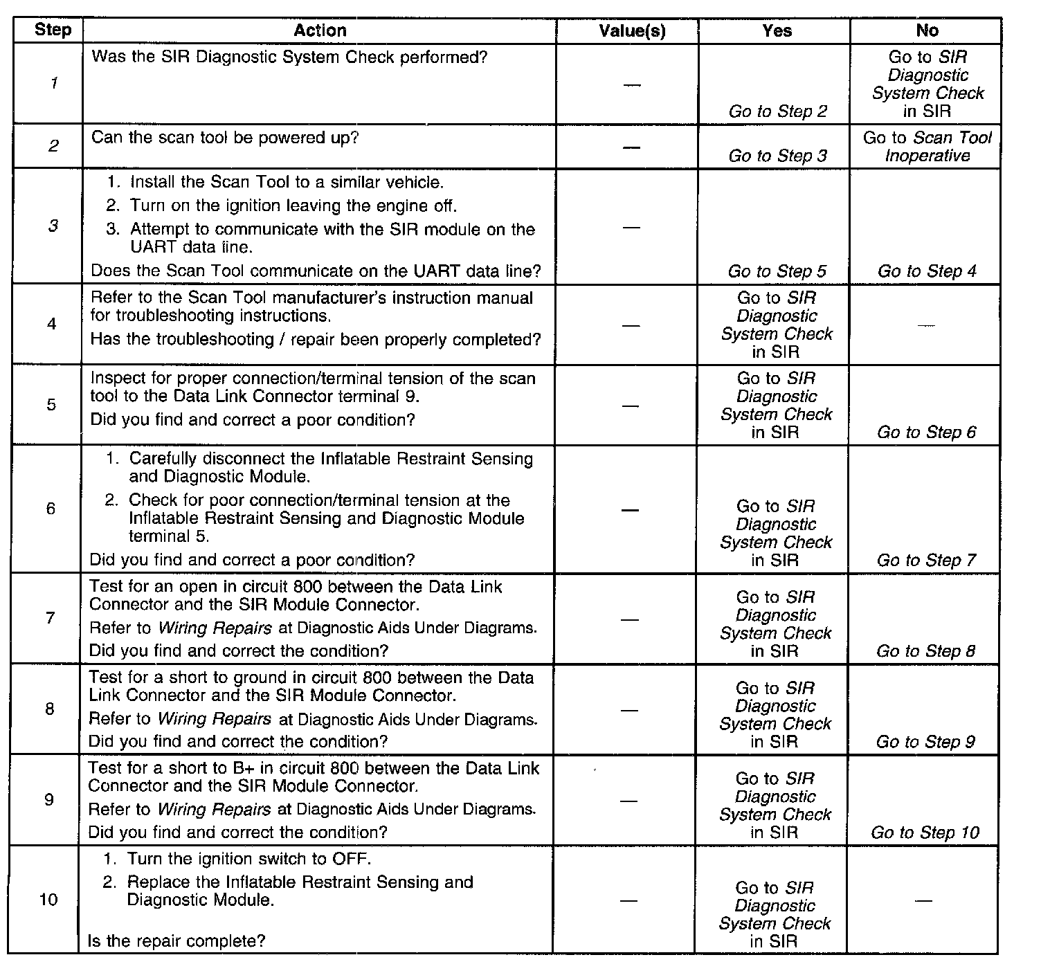 The UART Serial Data Line is used for communication with the SIR Module. The UART line relies on a 5 volt digital signal for the exchange of data between different control modules and to provide Scan Tool diagnostic data. When the ignition switch is in the RUN position and the UART line is at rest, i.e., no communication is taking place, the voltage remains HIGH at approximately 5 volts. When data is transmitted the voltage is pulled to ground, approximately 0 volts. The Supplemental inflatable Restraint System's Sensing and Diagnostic Module (SDM) utilizes UART communications. The Scan Tool may be used to retrieve, view, and clear Diagnostic Trouble Codes (DTC's) stored in the SDM. The Scan Tool also uses the UART line to receive serial data from the SDM. A loss of UART communications would prevent the Scan Tool from communicating with the SDM during SIR system diagnosis.