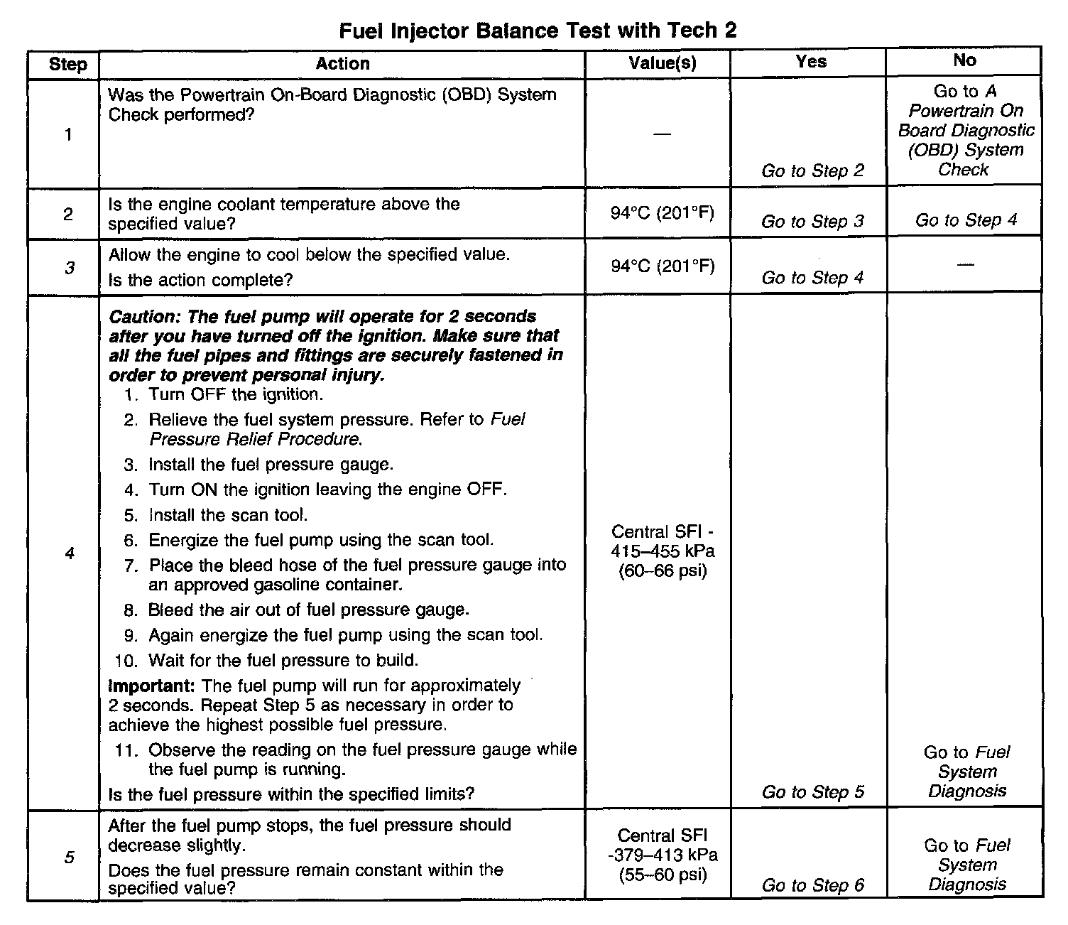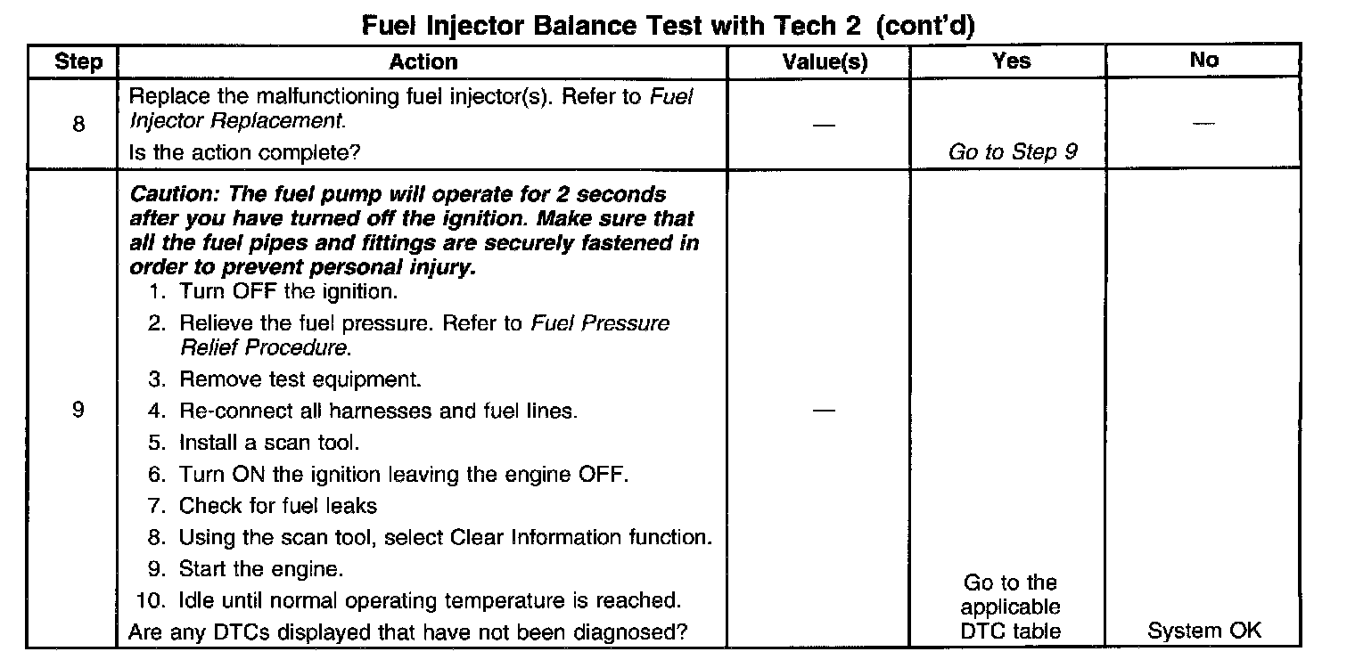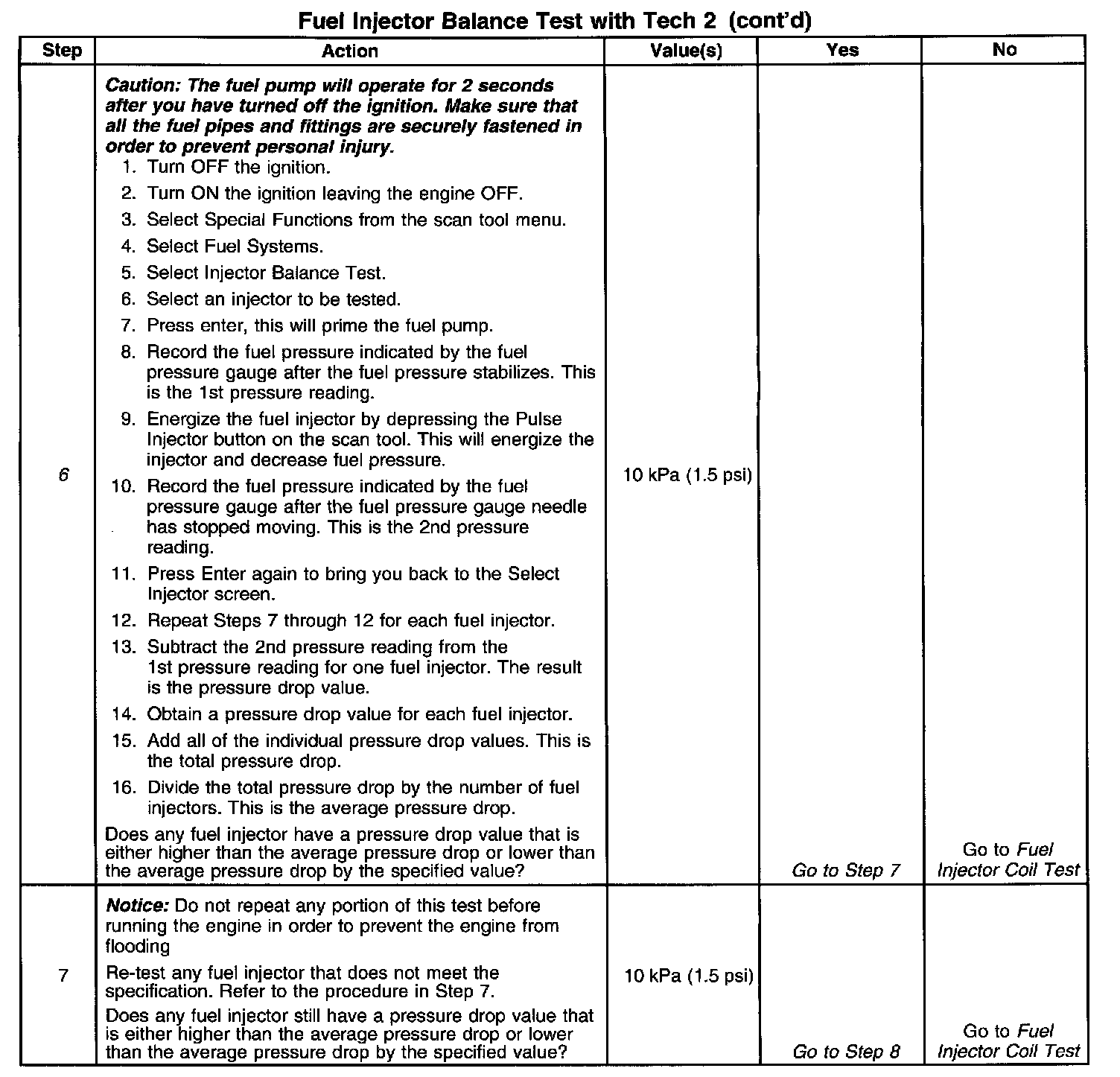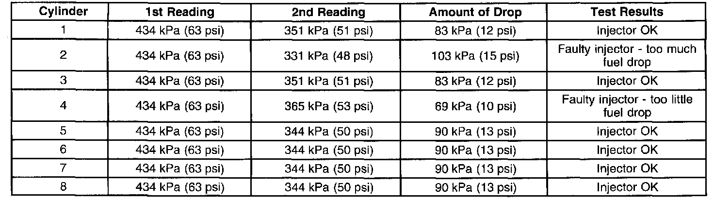 Test Results: Combine all of the injector pressure drops and divide this number by the amount of injectors available. This is the average pressure drop. Each individual injectors pressure drop value must be within 10 kPa (1.5 psi) of the average pressure drop value.