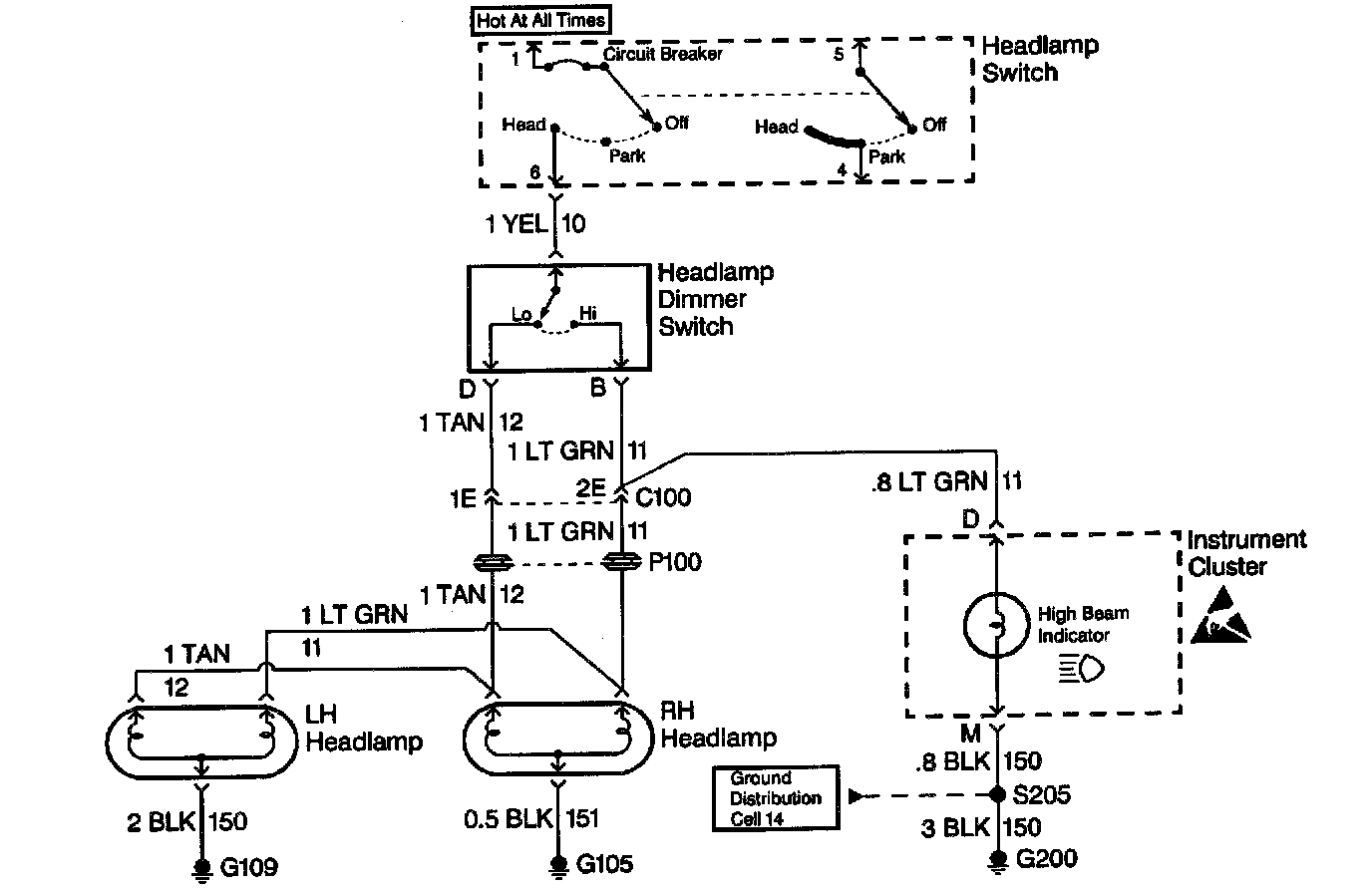 At this point analyze and (diagnose the problem), and develop text. Since the high beam indicator illuminated when the headlamp dimmer switch was in the high position, the high contacts of the headlamp dimmer switch and the LT GRN wire between the headlamp dimmer switch and C100 are good.