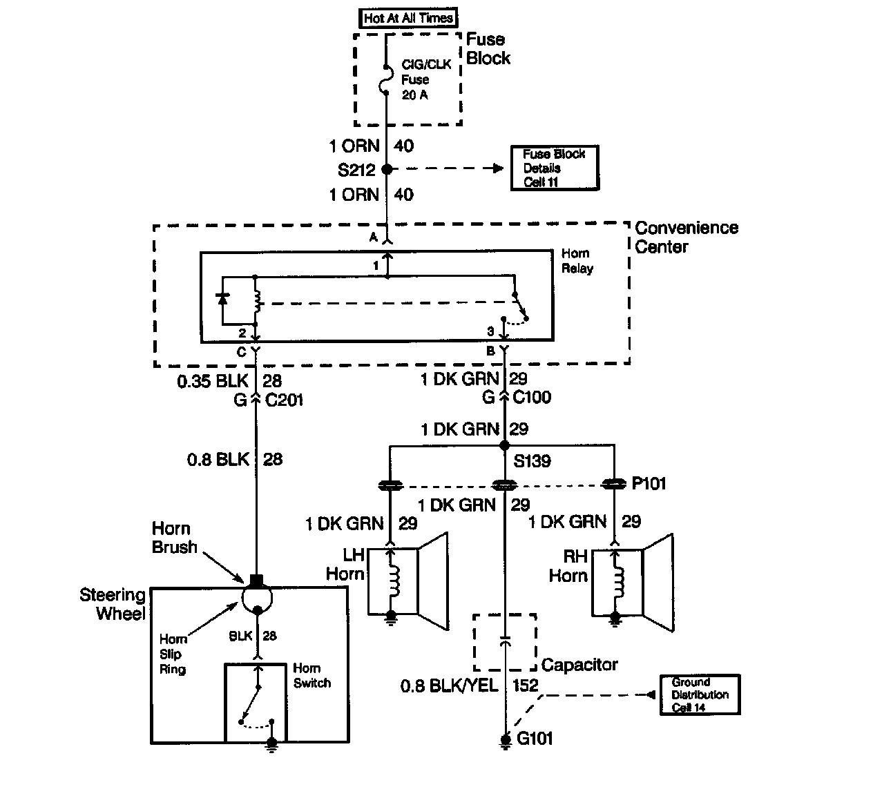 IMPORTANT: The schematic does not represent the components and wiring as they physically appear on the vehicle. For example, a 4-foot length of wire is treated no differently in a schematic from one which is only a few inches long.When diagnosing a horn problem use the service information located in the Horns service category. The above schematic is a typical example of a schematic with its supporting text.