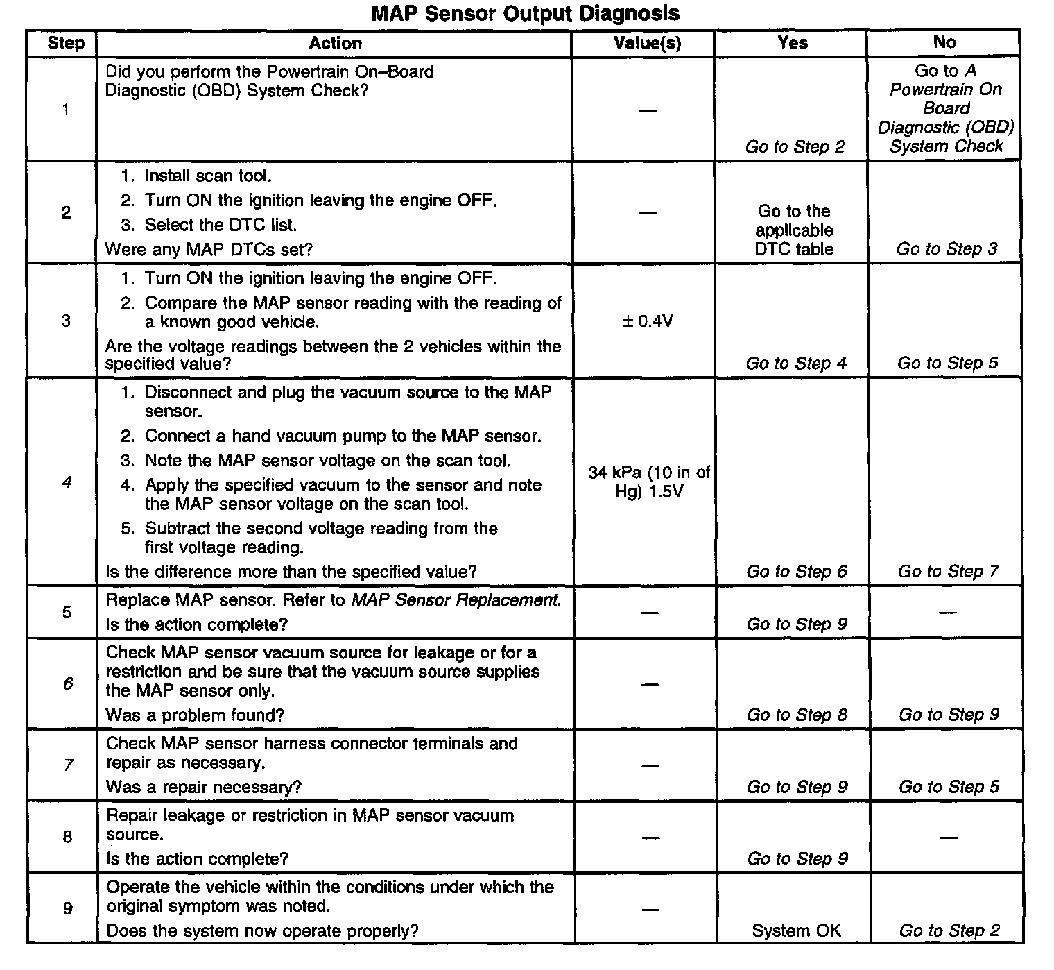 4. Applying 34 kPa (10 in of Hg) vacuum to the MAP sensor should cause the voltage to be 1.5 to 2.1 volts less than the voltage at Step 3. Upon applying vacuum to the sensor, the change in voltage should be instantaneous. A slow voltage change indicates a malfunctioning sensor.