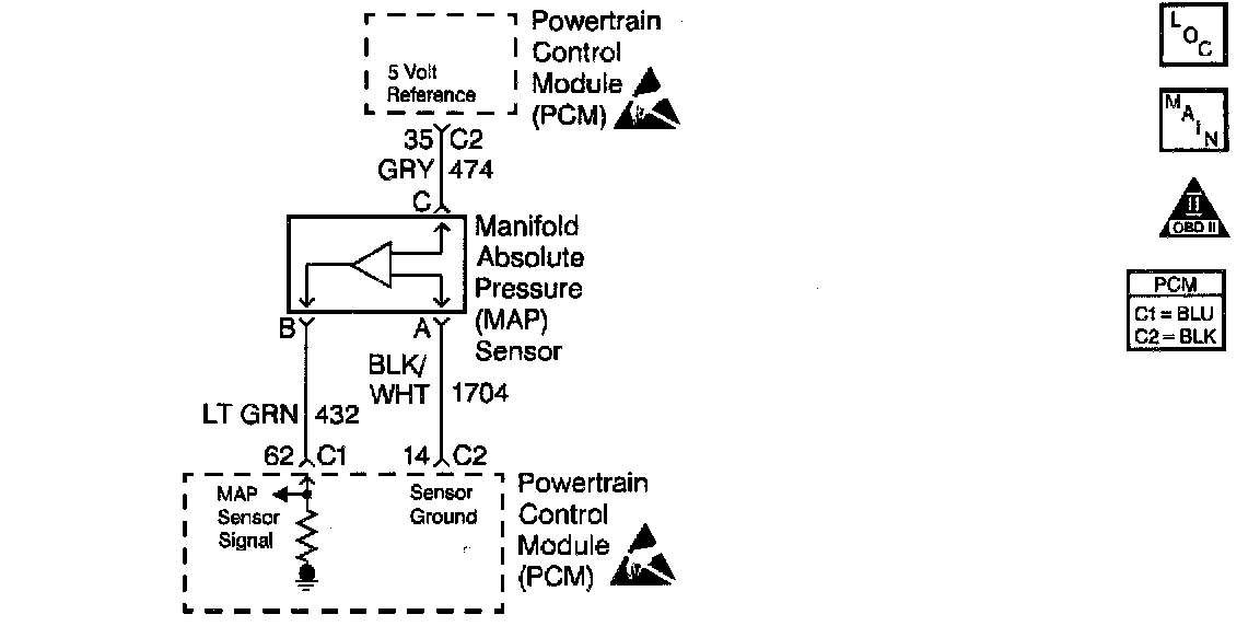The Manifold Absolute Pressure (MAP) sensor measures the changes in the intake manifold pressure which result from the engine load (intake manifold vacuum) and the RPM changes then converts these into a voltage output. The Powertrain Control Module (PCM) supplies a 5 volt reference voltage to the MAP sensor. As the manifold pressure changes, the output voltage of the sensor also changes. By monitoring the sensor output voltage, the PCM knows the manifold pressure. A lower pressure (low voltage) output voltage will be about 1.0 to 1.5 volts at idle. While high pressure (high voltage) output voltage will be about 4.5 to 4.8 volts at Wide Open Throttle (WOT). The MAP sensor is also used, under certain conditions, to measure barometric pressure, allowing the PCM to make adjustment for different altitudes. The PCM uses the MAP sensor in order to control the fuel delivery and the ignition timing.