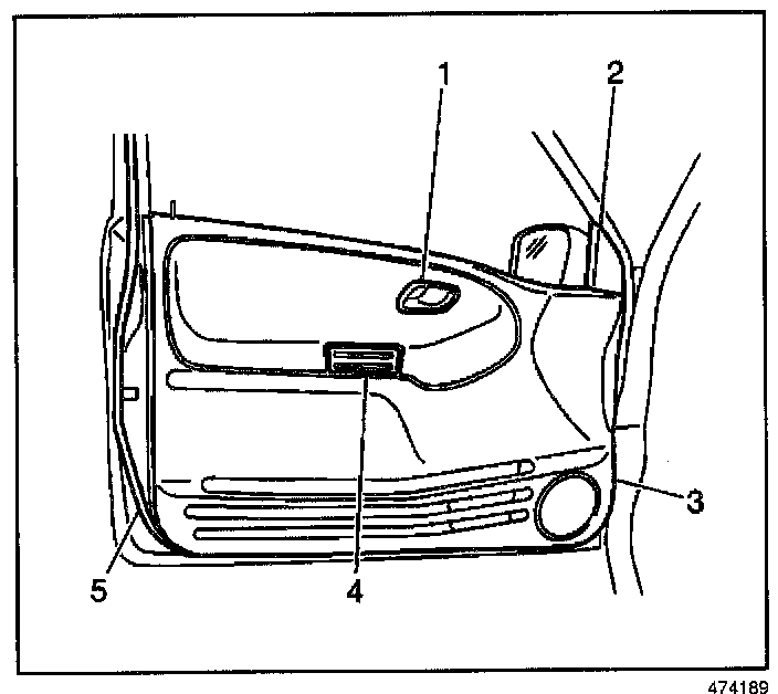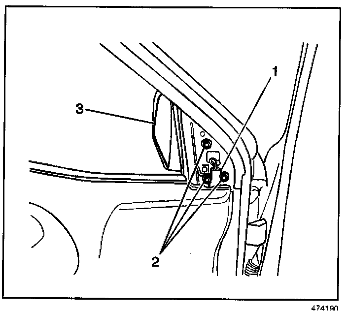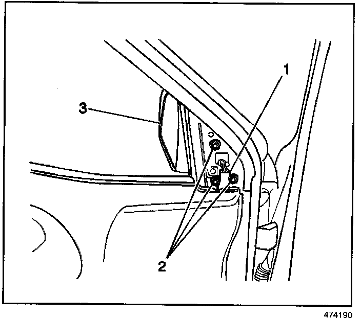 2. Remove the 3 bolts (2) and outside rearview mirror (3) from the door.