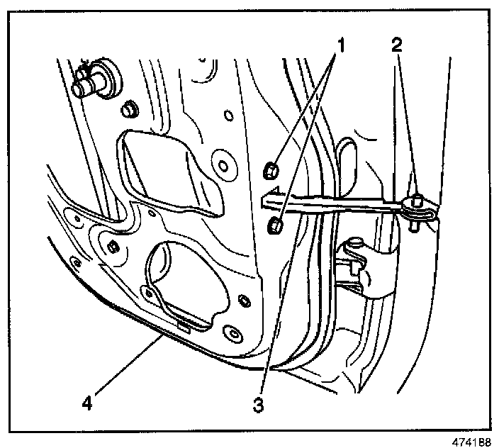 2. Install the front side door check (3) to the door jamb. Secure the check with the pin (2).