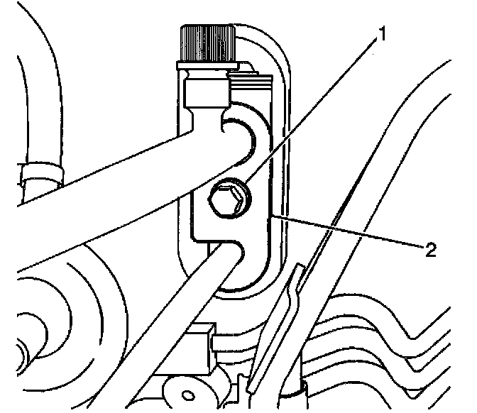 5. Remove the bolt (1) and slide the plate (2) counterclockwise in order to remove the evaporator inlet and outlet tubes at the bulkhead.