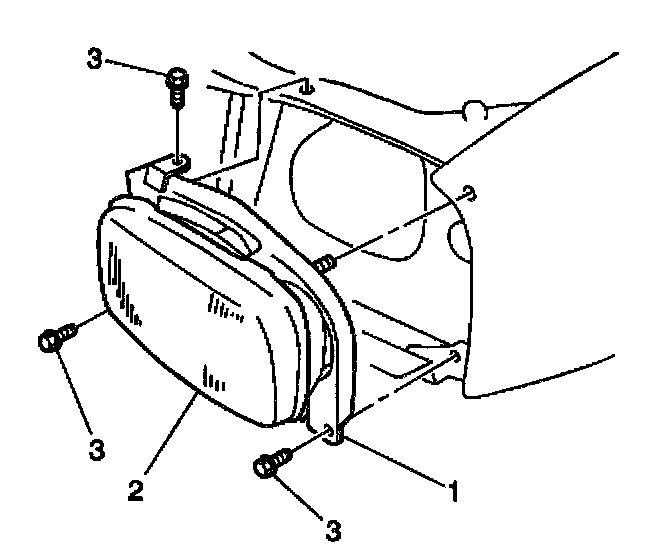 1. Install the headlamp assembly (1,2) to the vehicle. Secure the assembly with the 3 bolts (3).