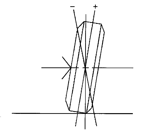 Camber is the tilting of the wheels from the vertical when viewed from the front of the vehicle. When the wheels tilt outward at the top, the camber is positive (+). When the wheel tilts inward at the top, the camber is negative (-). The amount of tilt is measured in degrees from the vertical. Camber settings influence the directional control and the tire wear.