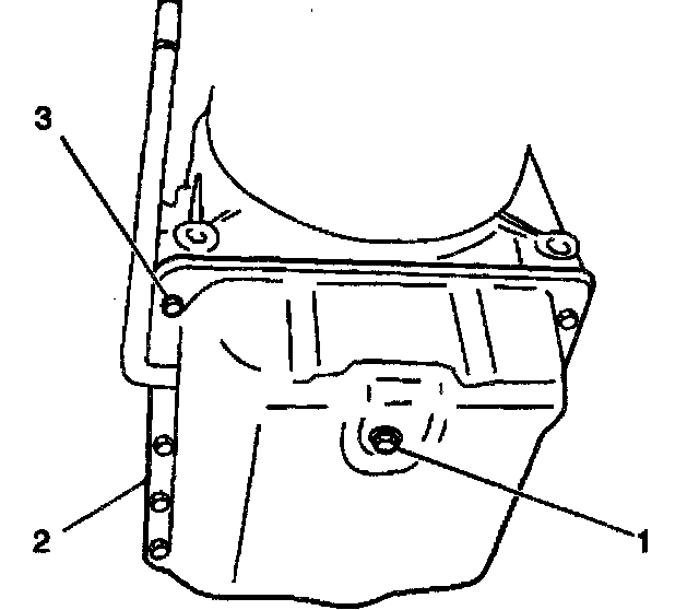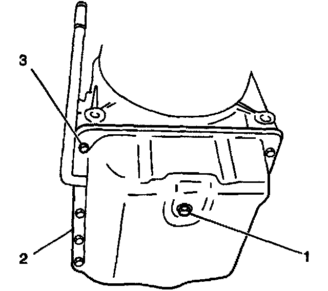 9. Remove the 14 transmission fluid pan bolts (3) from the transmission fluid pan.