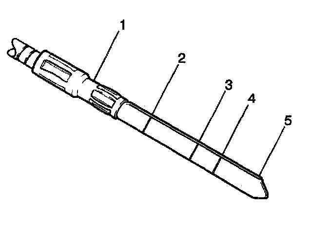 9.10. Remove the indicator and check the fluid level. The level should be between the FULL HOT (2) and the LOW HOT (3) marks. If the level is below the LOW HOT mark, add fluid to bring the level to the FULL HOT mark. Bringing the fluid level from the LOW HOT mark to the FULL HOT mark requires 0.3 liters (0.3 quarts) of fluid. Use Dexron III automatic transmission fluid GM P/N 12346143, or the equivalent.