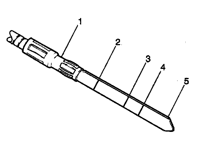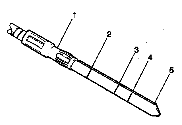 10. Remove the indicator and check the fluid level. The level should be between the FULL HOT (2) and LOW HOT (3) marks. If the level is below the LOW HOT mark, add fluid to bring the level to the FULL HOT mark. Bringing the fluid level from the LOW HOT mark to the FULL HOT mark requires 0.3 liters (0.3 quarts) of fluid. Use Dexron-III automatic transmission fluid GM P/N 12346143, or the equivalent.