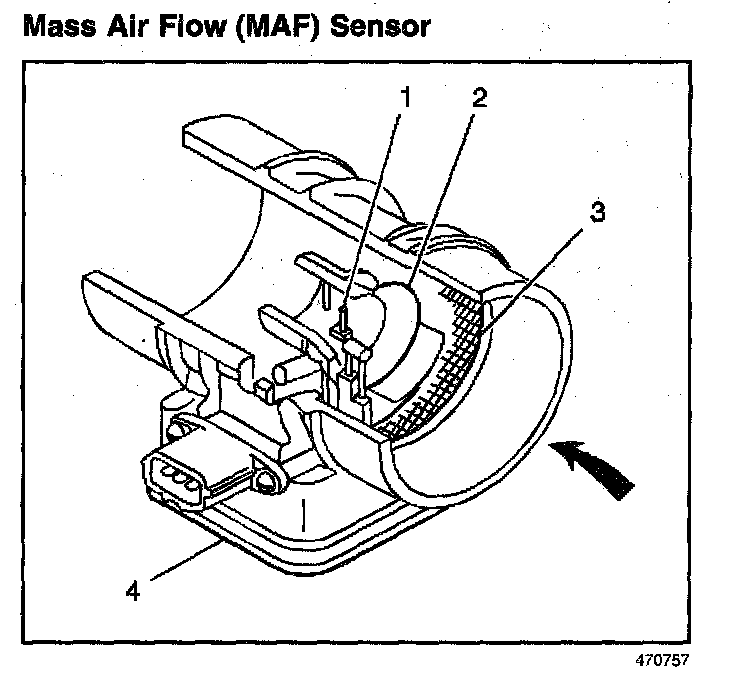 The Mass Air Flow (MAF) sensor consists of a heat resistor element (1), a metering duct (2), an air straightening screen (3), a body and control circuit board (4). This MAF sensor is of the thermal control type. The heat resistor is cooled off by the air entering the MAF sensor. The control circuit maintains the heat resistor temperature within a predetermined range.