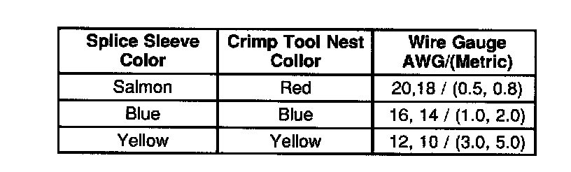 Use crimp and seal splice sleeves to form a one-to-one splice on all types of insulation except tefzel and coaxial to form a one-to-one splice. Use tefzel and coaxial where there is special requirements such as moisture sealing. Follow the instructions below in order to splice copper wire using crimp and seal splice sleeves.Crimp and Seal Splice Table