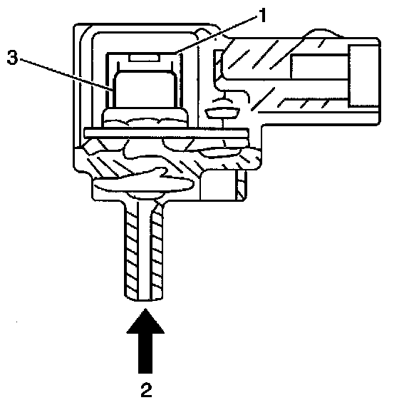 The Manifold Absolute Pressure (MAP) sensor (1) measures the change in the intake manifold pressure (vacuum) (2). The Powertrain Control Module (PCM) applies 5 volts to the MAP sensor. The MAP sensor consists of a semi-conductor type pressure sensing element (3). The pressure sensing element converts a change in pressure into an electrical signal. The MAP sensor also contains electronic circuitry that amplifies and corrects the electrical signal. The PCM monitors the change in manifold pressure that results from the changes in RPM and engine load. A low MAP sensor voltage reading at the PCM indicates low manifold pressure. A high MAP sensor voltage reading at the PCM indicates high manifold pressure.