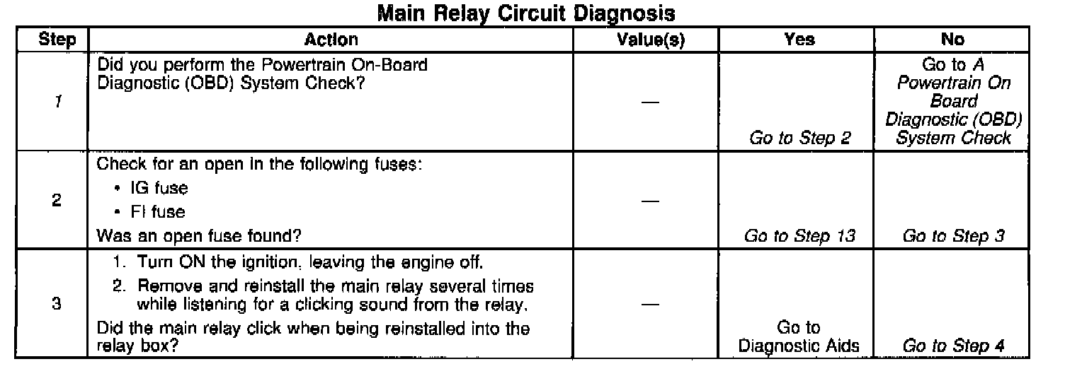 ^ The performance of the main relay may be affected by temperature. Check the main relay after sitting outside overnight and after running the engine 30 minutes.