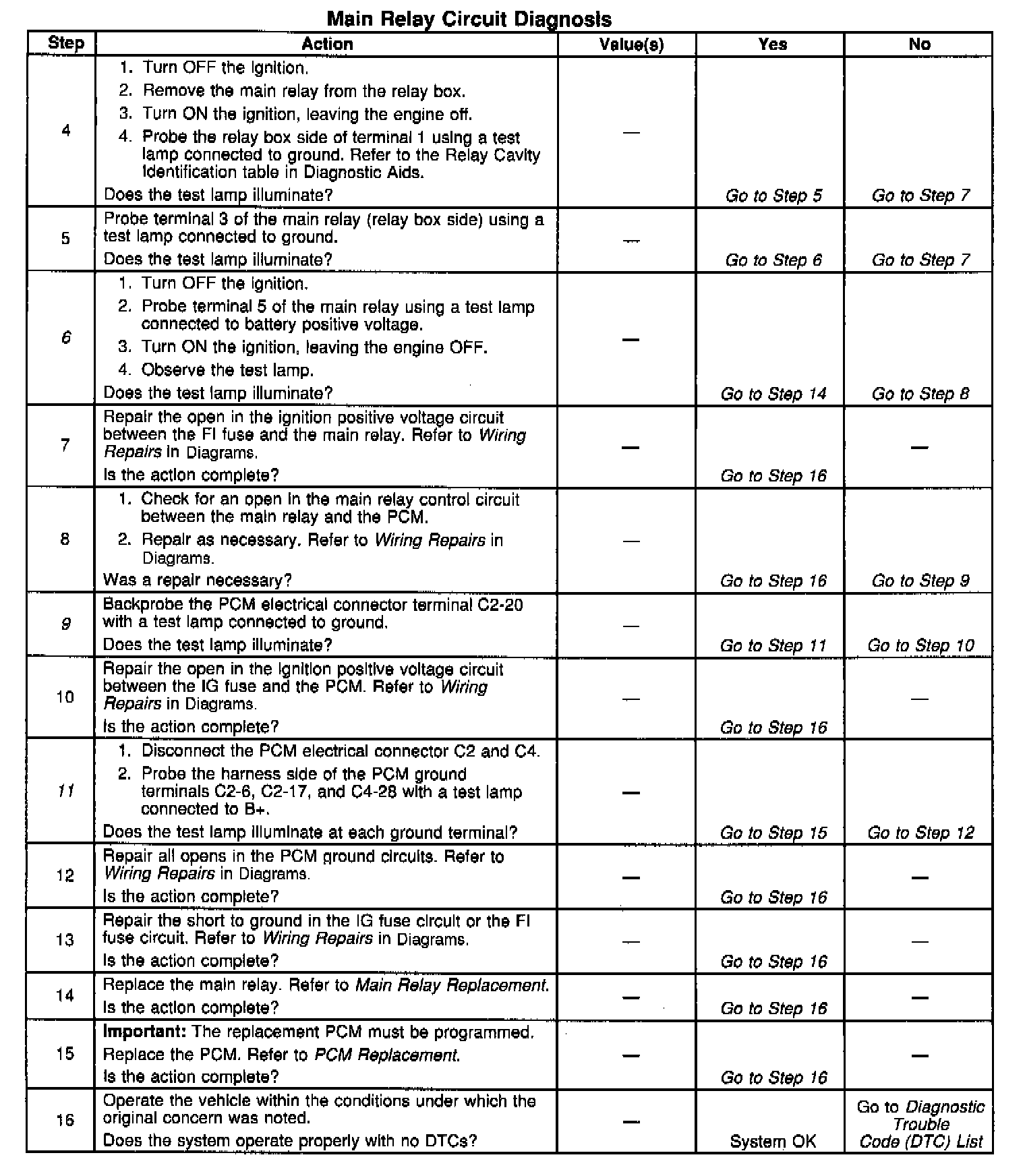 11. This step checks for an open in the PCM electrical grounds. The PCM will not operate the main relay if there are no electrical grounds.