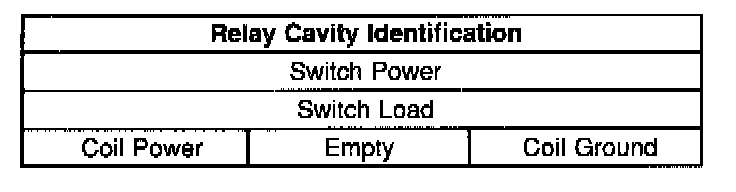 Use the following relay cavity table in order to locate the correct cavities to probe during diagnosis. The table layout corresponds to the cavity layout of the relay block.