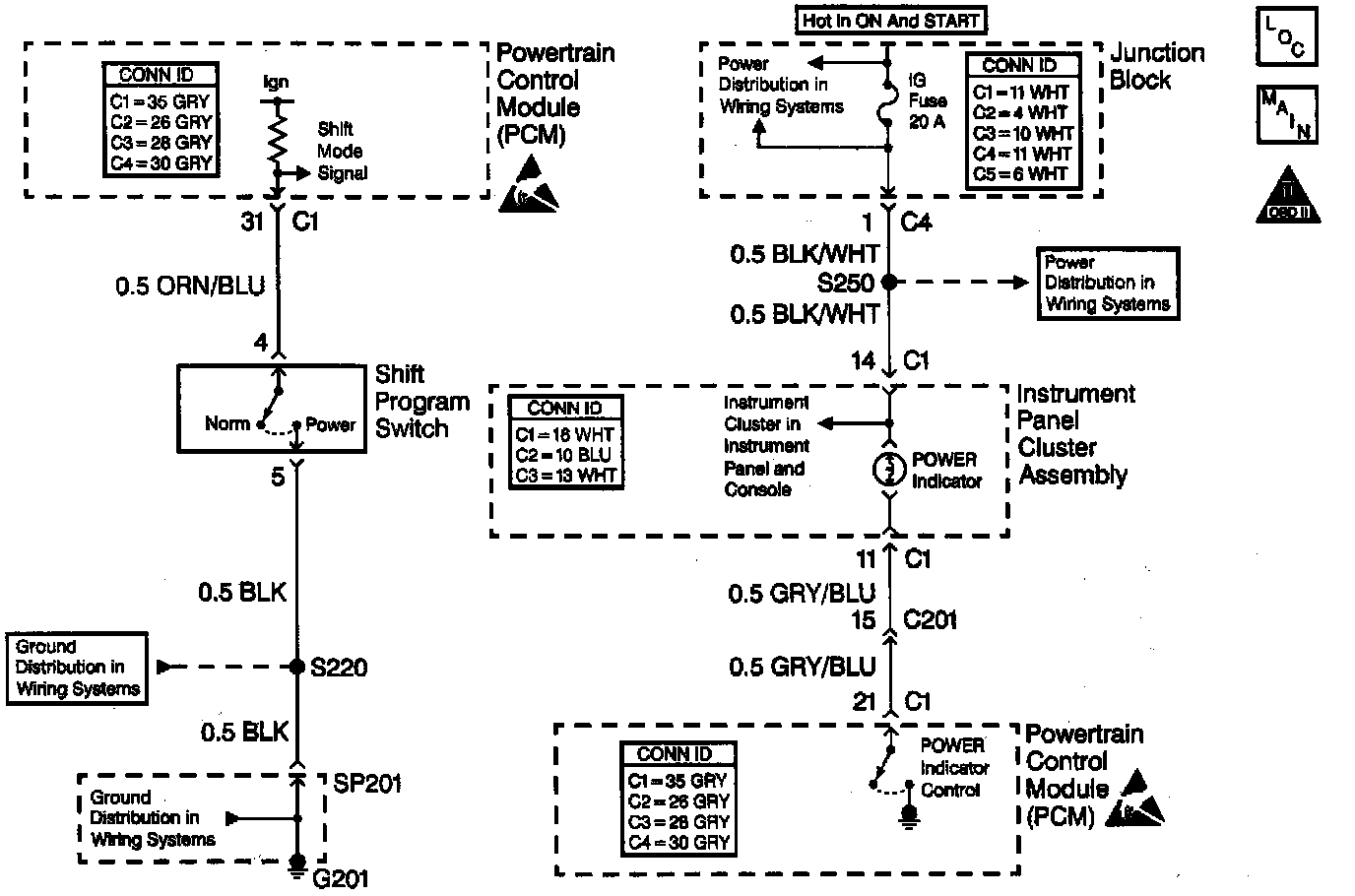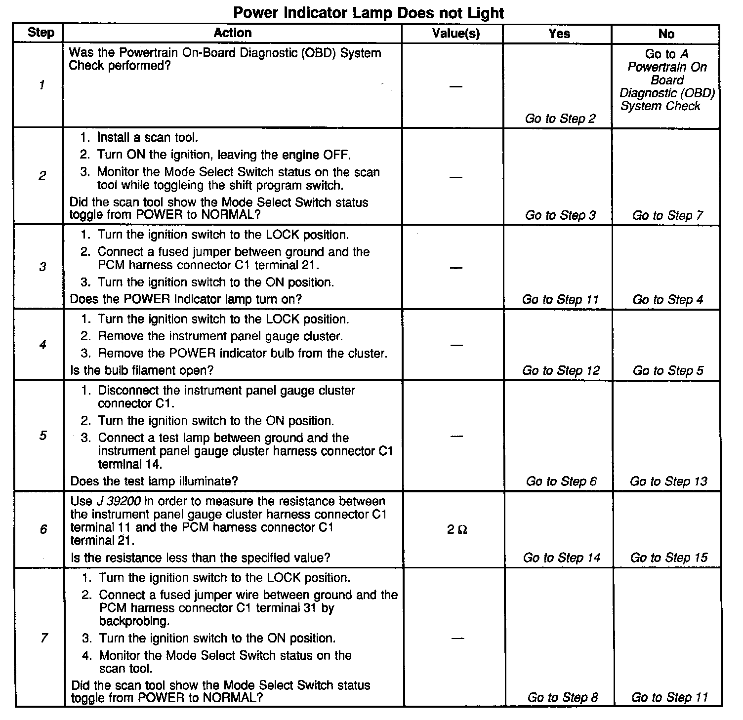 When the ignition switch turns ON, the Powertrain Control Module (PCM) performs a 3-second POWER indicator bulb check. The PCM performs the bulb check by grounding the POWER indicator control circuit. The Power/Normal switch button grounds the shift mode signal circuit to the PCM when the Mode Select Switch sets to POWER. The above condition causes the PCM to ground the POWER indicator control circuit. Grounding the POWER indicator control circuit turns on the POWER indicator lamp located in the instrument panel gauge cluster. The POWER indicator informs the driver that the PCM is using the Power gear shift schedule (delaying upshifting for improved acceleration).