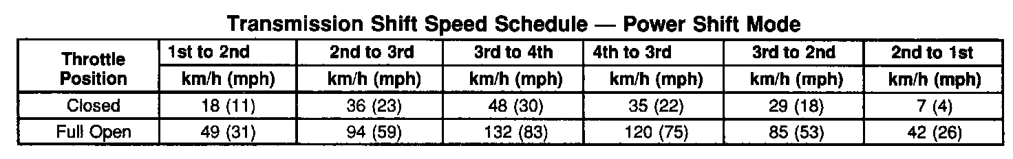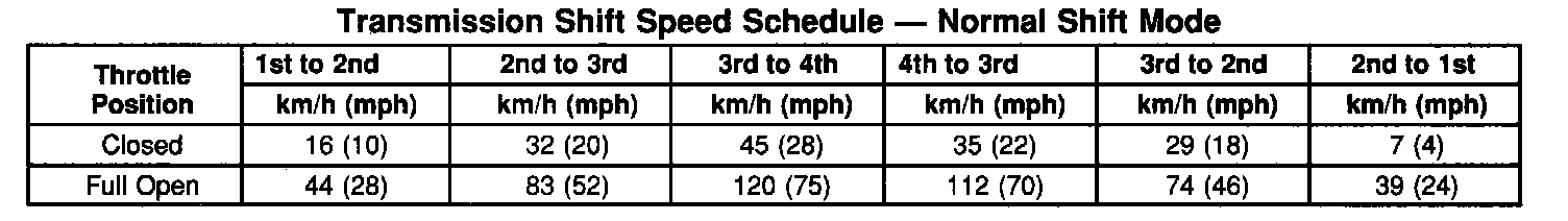 6. Monitor the vehicle speeds at points of downshifts. Verify that the gear downshifts and the TCC release occur properly as shown in the shift speed tables below. If the transmission is not within specifications, refer to Line Pressure Test for possible causes and corrections.