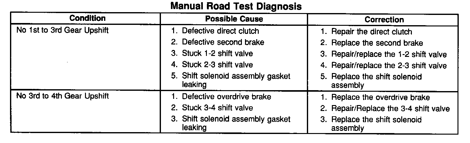 ^ If the transmission is still malfunctioning with the electronic control system disabled, the problem lies in the transmission. Refer to the Manual Road Test Diagnosis table.
