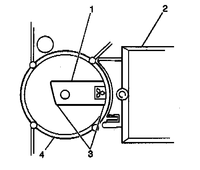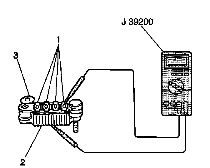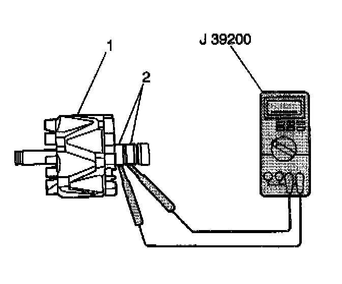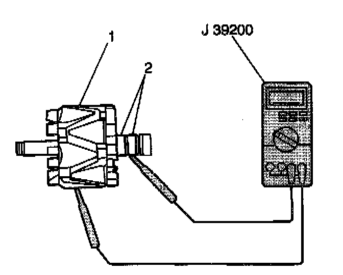 2. Measure the resistance between the rotor slip rings (2) and the rotor (1) using the J 39200. If the resistance is less than 5 ohms, replace the rotor.
