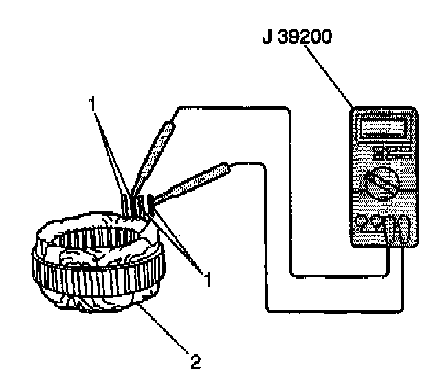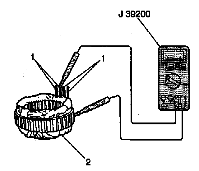 4. Measure the resistance between all stator leads (1) using J 39200. If the resistance is greater than 5 ohms for any measurement, replace the stator (2).