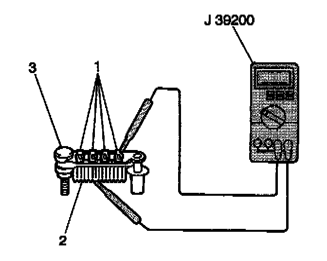 8. Measure the resistance between the rectifier lower body (2) and each diode lead (1) using the J 39200. Reverse the probes and measure the resistance again. The resistance should be less than 5 ohms in one measurement and greater than 5 ohms in the other measurement. If not, replace the rectifier.