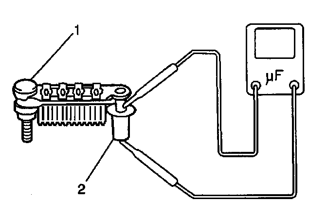 10. Measure the condenser (2) capacity using a digital capacitor meter. If the condenser capacity is not 0.5 microfarads, replace the rectifier (1).