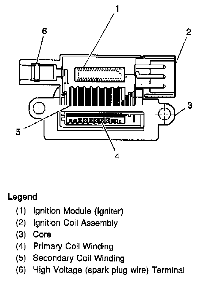 The ignition coil (2) has a high voltage output terminal and boot, that provides spark directly to the spark plug (3). Each ignition coil assembly has a built-in ignition module (igniter) that controls the current flow in the primary coil winding. The secondary coil voltage travels directly to the spark plug, increasing secondary ignition voltage by eliminating the spark plug wire.