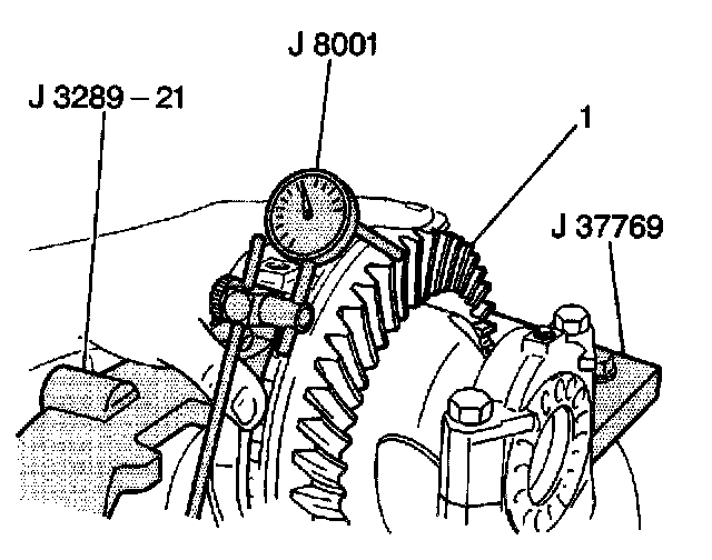 1. Install the J 8001 to the differential carrier with the dial indicator plunger against a ring gear tooth.