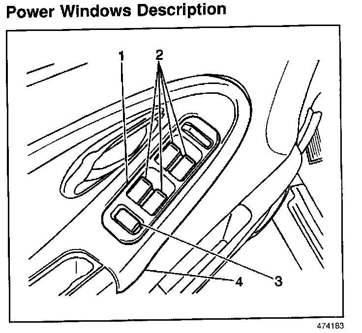 The right front, the left rear or the right rear windows are operational by using either the left front side master window switch (1) or the individual switch on each door. The left front side master window switch (1) also contains circuitry for the AUTO DOWN and WINDOW LOCk features. The AUTO DOWN feature allows the left front window to open automatically to the fully open position. The WINDOW LOCK feature allows the right front, left rear and right rear windows to be locked out. When you depress the window lock switch, operation of the right front, left rear or right rear is only possible through the left front side master window switch.