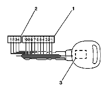 The key has 10 cut positions (1) with 4 different depths (2). Key cut postions are numbered 1-10, counting from the head of the key to the tip. The key cut depths are numbered 1-4, cut depth number 1 being the deepest. A 4-character key code is stamped on the knockout portion of the key head. The 4-character key code is cross referenced to a 10 digit number that corresponds to the cut and tumbler sequence. Knock the plugs out of the key head after code numbers have been recorded. The code list, available to owners of key cutting equipment from equipment suppliers, determines the lock combinations from the code numbers.