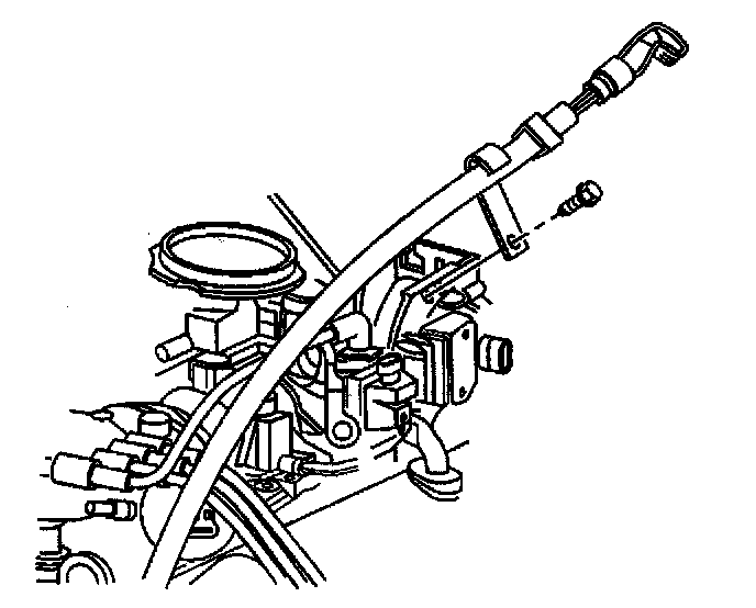 16. Remove the bolt holding the transmission fluid filler tube to the accelerator control cable bracket.