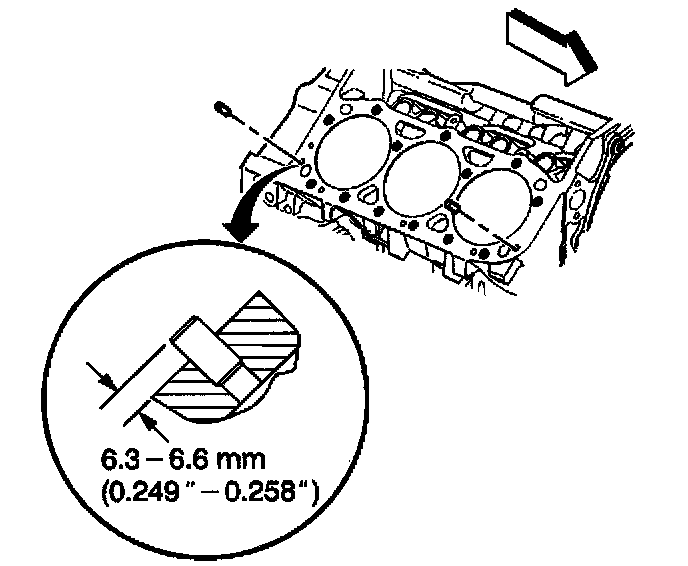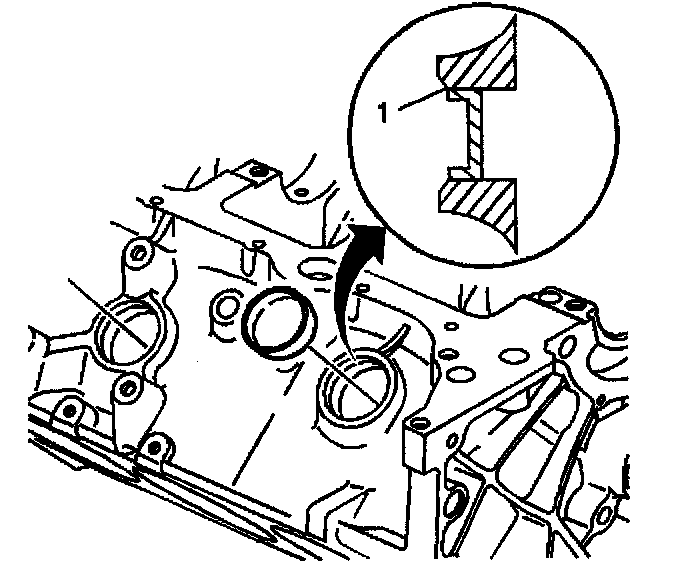 A properly installed engine block core hole plug must be installed flush with the bottom of the chamfer (1) of the engine block core hole.