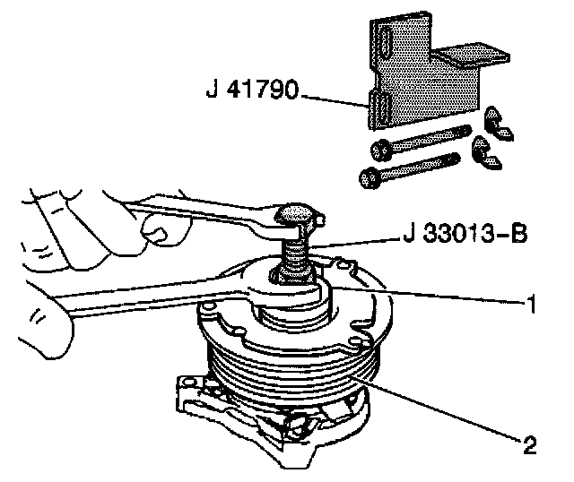 NOTE: Do not drive or pound on the clutch hub or shaft. Internal damage to the compressor may result. The forcing tip on the J 33013-B remover/installer center screw must be flat or the end of the shaft/axial plate assembly will be damaged.