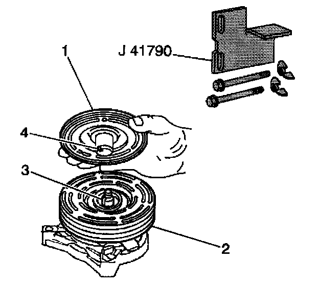 4. Place the clutch plate and the hub assembly (1) onto the compressor shaft.