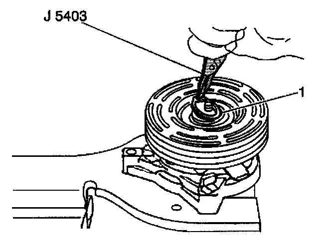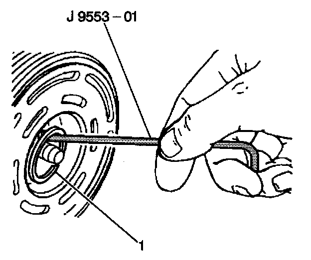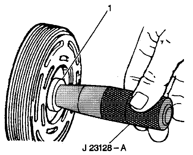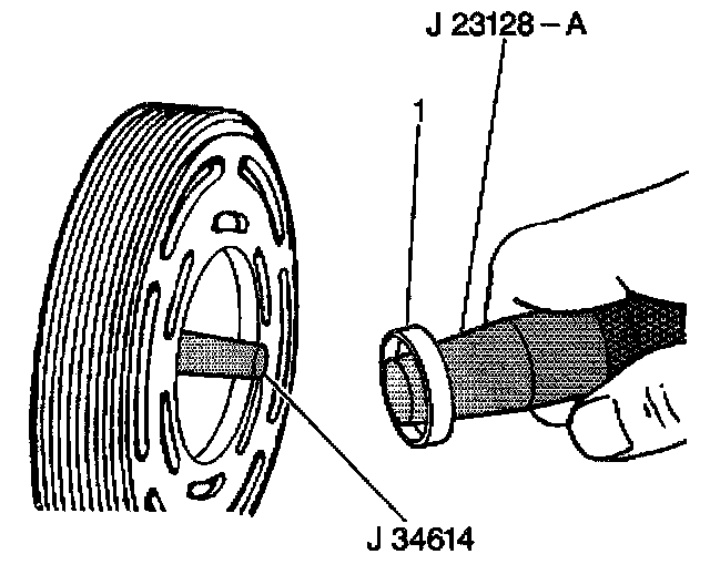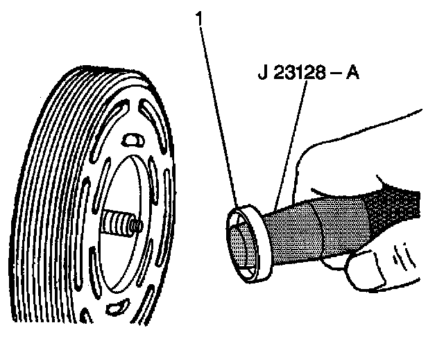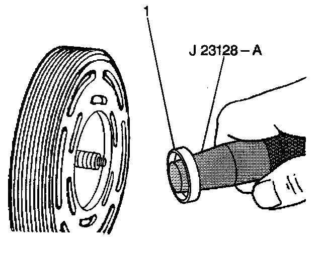 7. Engage the knurled tangs of the J 23128-A with the stamped steel case side of the lip seal (1) in order to ensure that the flared-out side of the lip seal (1) faces toward the compressor.