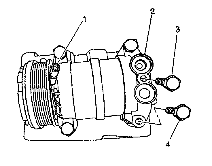9. Remove the compressor and condenser hose bolt (3) from the compressor.