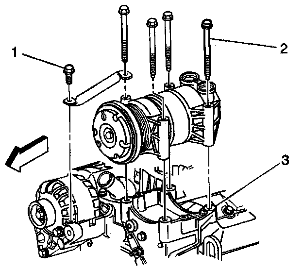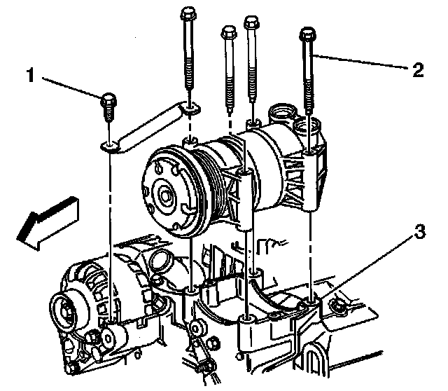 3. Install the compressor bolts (2).